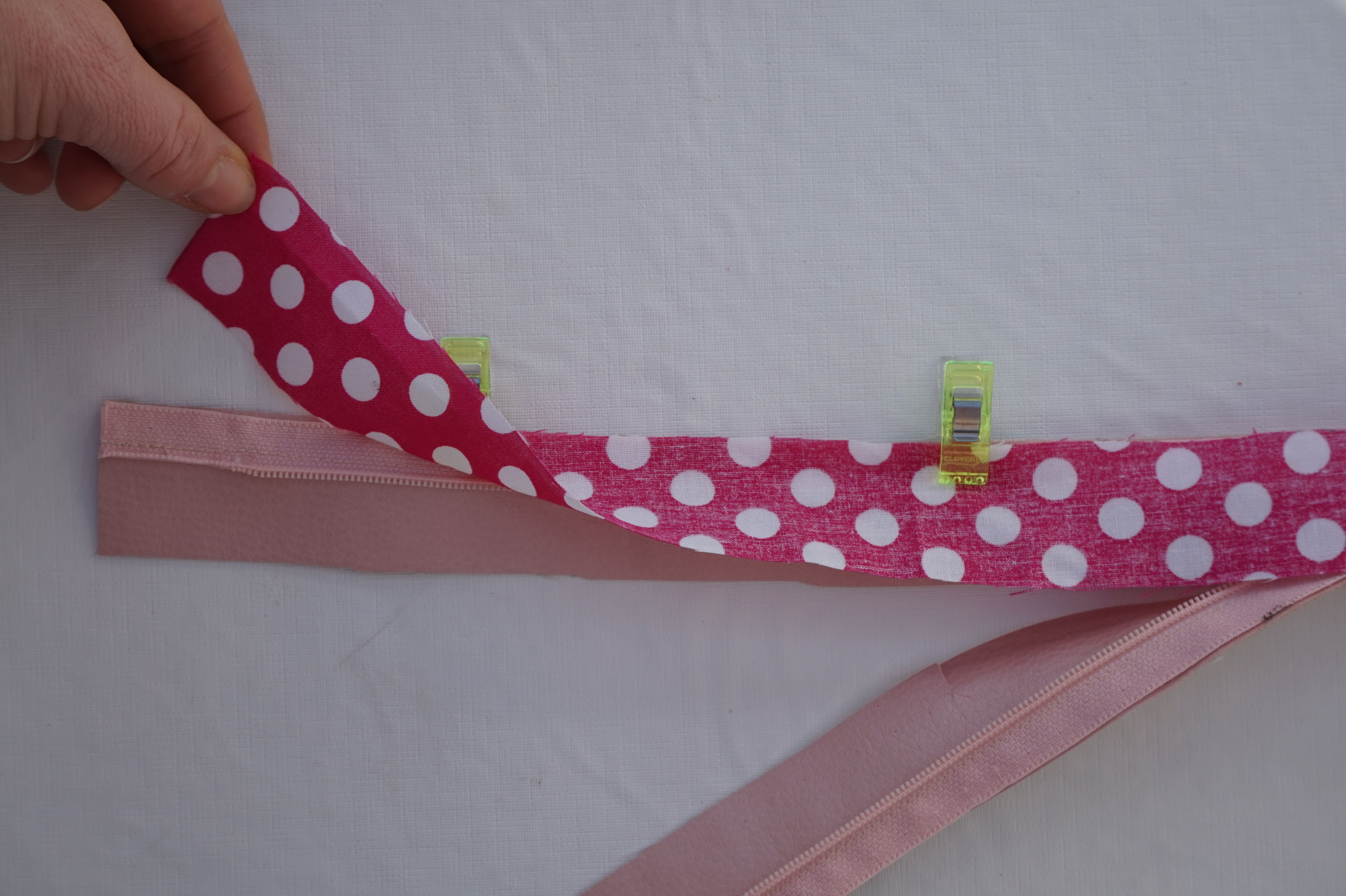 Reißverschluss an die Reißverschluss-Seitenteile nähen. Den Reißverschluss zwischen die Reißverschluss-Seitenteile (Teil B) aus Kunstleder und dem Baumwollstoff legen (die schönen Seiten der beiden Stoffe zeigen nach innen). Feststecken und nähen.